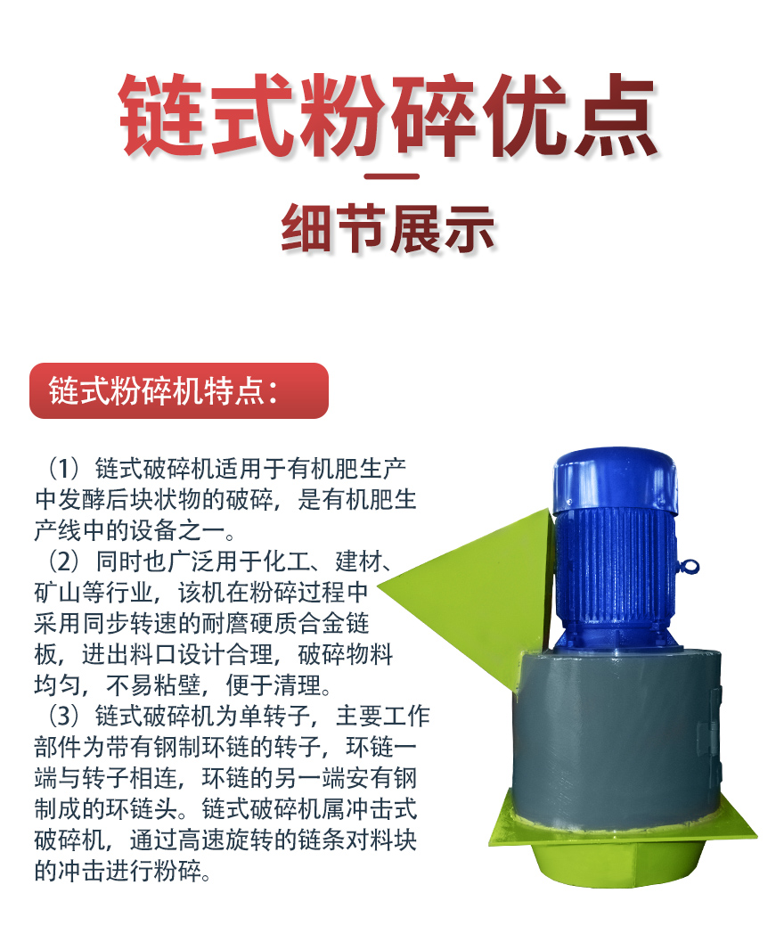 產品簡介:鏈式粉碎機主要用于粉碎水分小的物料和結塊物料。鏈式粉碎機廠家通達工業集團供應各種規格鏈式粉碎設備,年產5000-10萬噸有機肥成套設備,想知道鏈式粉碎機多少錢,請致電18530928888.